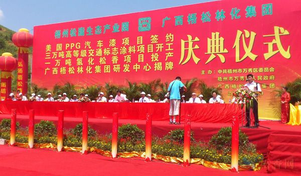自治區(qū)副主席楊道喜、梧州市委書(shū)記、市人大常委會(huì)主任劉志勇、梧州市委副書(shū)記、市長(zhǎng)王凱、梧州市政協(xié)主席吳漢華、梧州市人大常委會(huì)副主任李奕權(quán)及市直、中直、區(qū)直有關(guān)部門(mén)領(lǐng)導(dǎo)、萬(wàn)秀區(qū)四家班子等領(lǐng)導(dǎo)出席慶典。自治區(qū)副主席楊道喜宣布三萬(wàn)噸高等級(jí)交通標(biāo)志涂料項(xiàng)目開(kāi)工暨一萬(wàn)噸氫化松香項(xiàng)目投產(chǎn),并與劉志勇書(shū)記共同為廣西梧松林化集團(tuán)研發(fā)中心、國(guó)家高新技術(shù)企業(yè)揭牌;合作方美國(guó)PPG工業(yè)集團(tuán)汽車(chē)漆全球運(yùn)營(yíng)總監(jiān)卡里根·拉里及亞太區(qū)、中國(guó)區(qū)相關(guān)負(fù)責(zé)人、瑞典Colorpoint交通漆(彩點(diǎn)公司)總經(jīng)理湯尼斯·安尼特等外商出席并與梧松集團(tuán)董事長(zhǎng)孔仕才簽署合作協(xié)議。