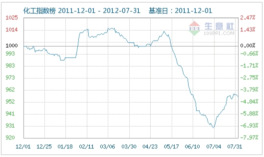 7月31日化工指數(shù)為956點,較昨日下降了1點,較周期內(nèi)最高點1016點(2012-03-13)下降了5.91%,較2012年07月03日最低點929點上漲了2.91%。(注:周期指2011-12-01至2012年7月31日)
