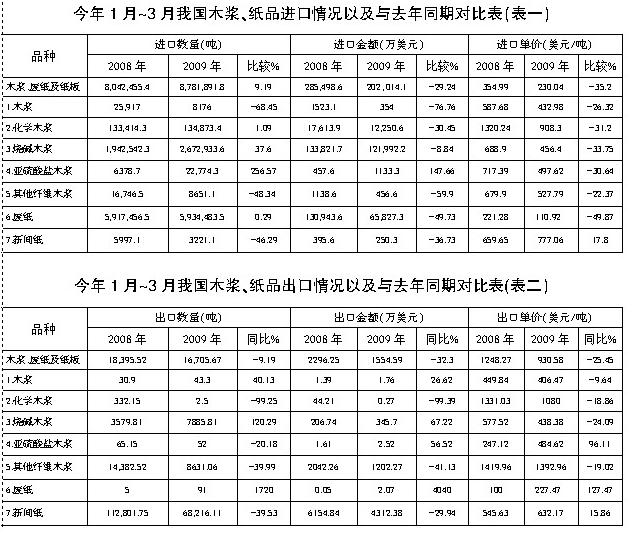 下面結(jié)合國(guó)家海關(guān)最近提供的最新統(tǒng)計(jì)數(shù)據(jù)(見(jiàn)表1、表2),對(duì)今年第一季度我國(guó)木漿、紙品幾個(gè)品種以及新聞紙進(jìn)、出口總體情況進(jìn)行比較和分析。