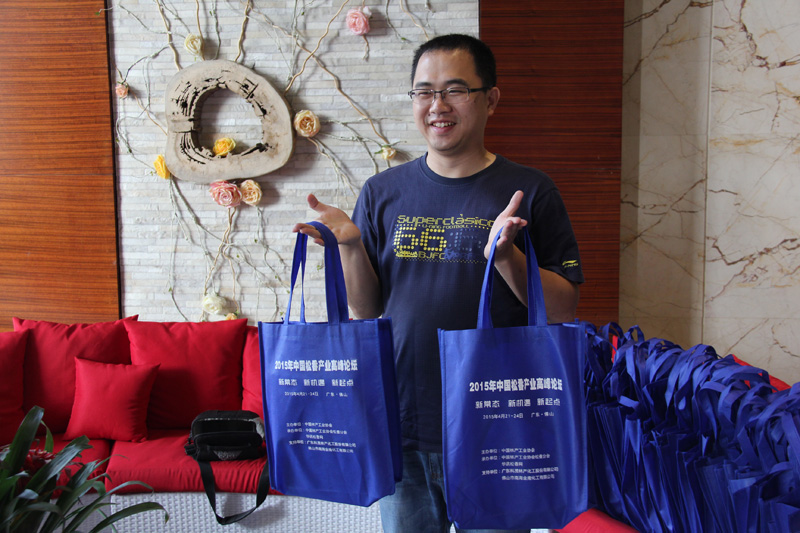 (華訊松香網(wǎng)業(yè)務(wù)部經(jīng)理吳明宇在展示已裝好的論壇資料袋)