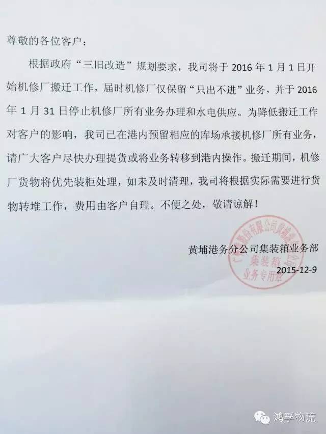 接到黃埔港務(wù)分公司集裝箱業(yè)務(wù)部通知,將于2016年1月1日開(kāi)始機(jī)修廠搬遷工作。我司將配合黃埔港務(wù)公司集裝箱業(yè)務(wù)部處理貨物轉(zhuǎn)堆工作的通知,機(jī)修廠將“只進(jìn)不出“。請(qǐng)機(jī)修廠有貨物的客戶(hù)盡快安排出運(yùn)或者提貨事宜,需要我司配合的請(qǐng)盡快聯(lián)系,以免造成不必要的損失。不便之處,敬請(qǐng)諒解!