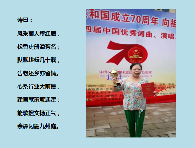 筆者注:在松香行業(yè),有一位大家耳熟能詳?shù)柠惾?,她的名字叫繆紅鷹,曾在松香界默默耕耘、誠(chéng)信經(jīng)營(yíng)了幾十載;退休后,她仍心系行業(yè)前途,常為行業(yè)發(fā)展建言獻(xiàn)策;她又能歌善舞,擅長(zhǎng)詩(shī)賦,一身正氣,時(shí)常著文宣揚(yáng)世間正能量; 其巾幗不讓須眉,贏得業(yè)內(nèi)的崇敬與贊揚(yáng)!