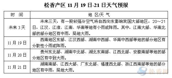 華訊松香網(wǎng)溫馨提醒:未來(lái)三日,新一股較強(qiáng)冷空氣將自西向東影響我國(guó),江南大部、華南地區(qū)有小到中雨或陣雨,局地大雨,上山采脂工人需注意天氣變化,合理安排采收。據(jù)天氣預(yù)報(bào)網(wǎng)報(bào)道,預(yù)計(jì)未來(lái)10天,影響我國(guó)的冷空氣活動(dòng)較頻繁,北方地區(qū)氣溫起伏多變;江淮、江南等地氣溫較常年同期偏低1-2℃,對(duì)松樹(shù)出脂率略有影響,采脂工人的積極性或降低。