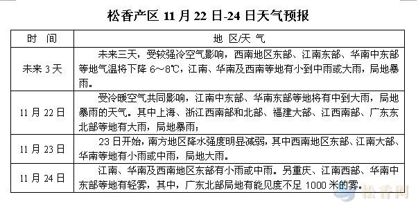 華訊松香網(wǎng)溫馨提醒:未來(lái)三日,受較強(qiáng)冷空氣影響,西南地區(qū)東部、江南東部、華南中東部等地氣溫將下降6~8℃。另局部受冷暖空氣共同影響,將迎來(lái)明顯降雨過(guò)程,其中江南中東部、華南東部等地將有中到大雨,局地暴雨的天氣。多數(shù)產(chǎn)區(qū)臨近產(chǎn)季尾期,頻繁的降溫降雨天氣或使采脂工積極性進(jìn)一步降低,局地采脂工下山步伐或加快。