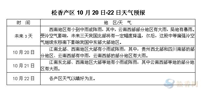 華訊松香網(wǎng)提醒:未來(lái)三天松香產(chǎn)區(qū)除了云南部分地區(qū)有降雨之外,其他地區(qū)天氣變化不大。值得關(guān)注的是,將有一股強(qiáng)冷空氣影響我國(guó)北部,之后會(huì)東移南下影響我國(guó)中東部大部分地區(qū),屆時(shí)或?qū)⒂绊懡?、福建等產(chǎn)區(qū)最后一批松脂的下山。