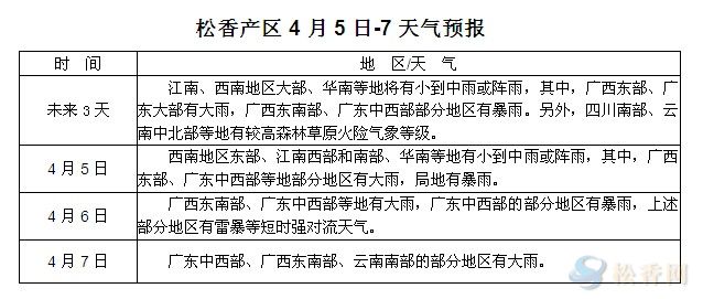 華訊松香網提醒:未來三天,兩廣及云南部分地區(qū)降雨強度較大,但各松香產區(qū)整體天氣均較晴好。清明節(jié)后各地氣溫逐漸升高,部分降水較少地區(qū)森林火線等級偏高,上山人員應注意防火。另外,受松香市場偏弱影響,有業(yè)內預計新脂下山時間或將推遲至端午節(jié)前后。