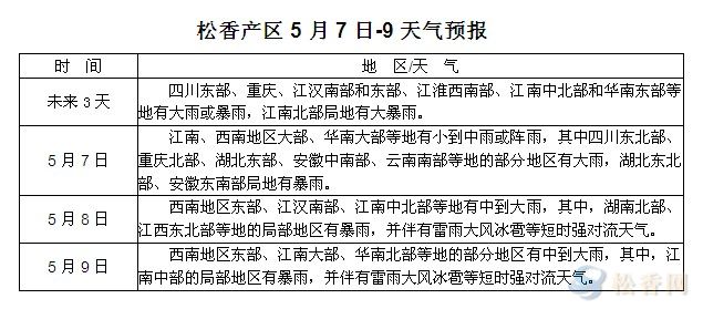 華訊松香網(wǎng)提醒:未來(lái)三天,華南大部天氣晴好,間有短時(shí)陣雨;閩贛湘滇部分地區(qū)降雨強(qiáng)度較大,或伴雷雨大風(fēng)或冰雹等強(qiáng)對(duì)流天氣。據(jù)分析,近日大部分松香產(chǎn)區(qū)天氣較為晴好,利于松樹(shù)出脂,請(qǐng)已上山的工人注意安排掛袋采脂時(shí)間。另廣西西南部(百色地區(qū))持續(xù)高溫,局部出現(xiàn)旱情,對(duì)于采脂的影響暫未顯現(xiàn),若短期內(nèi)沒(méi)有明顯改善,或會(huì)影響該地區(qū)新脂的下山時(shí)間。