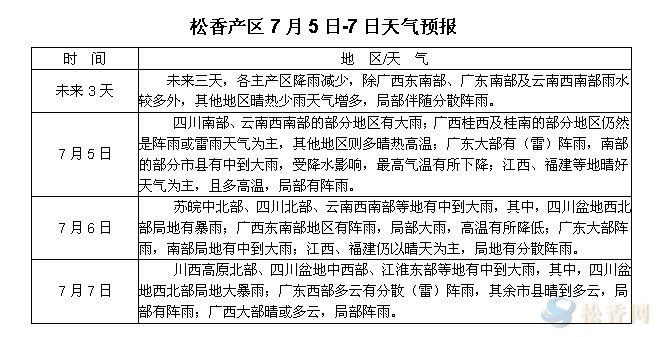 華訊松香網(wǎng)溫馨提醒:未來三天,各主產(chǎn)區(qū)降雨減少,以多云或晴熱少雨天氣為主,利于進(jìn)行松脂采收工作,隨著天氣轉(zhuǎn)晴,采脂工作恢復(fù)正常,部分產(chǎn)區(qū)松脂量較前兩日有所增多。另江南大部、華南北部等地維持35℃以上高溫天氣,江南中東部的部分地區(qū)可達(dá)37~38℃,上山人員需注意安排工作時(shí)間避免中暑。