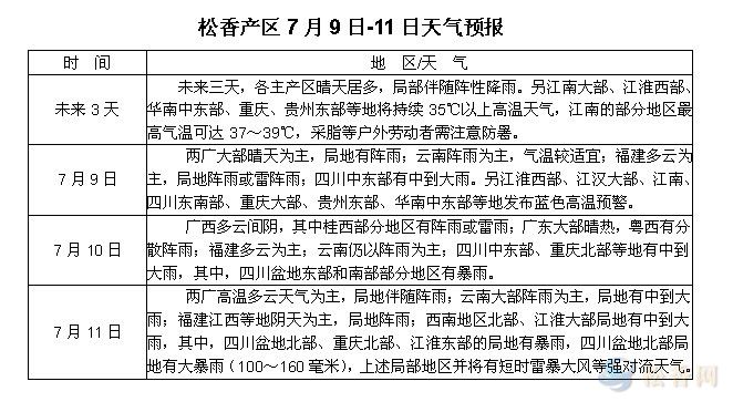 華訊松香網溫馨提醒:未來三天,各主產區(qū)以多云或晴熱少雨天氣為主,35℃以上的高溫天氣區(qū)域增多,上山人員需注意防暑降溫。另粵西局部、四川部分地區(qū)需注意防御強降水帶來的地質災害等影響。隨著產季深入,加上部分產區(qū)高溫伴有陣雨的天氣利于松樹出脂,本周下山松脂量或會較前增加,另近日部分地區(qū)松脂價格略有調整,對松脂供應商售脂積極性稍有影響,未來仍需繼續(xù)關注價格及天氣等對到廠松脂量的影響。