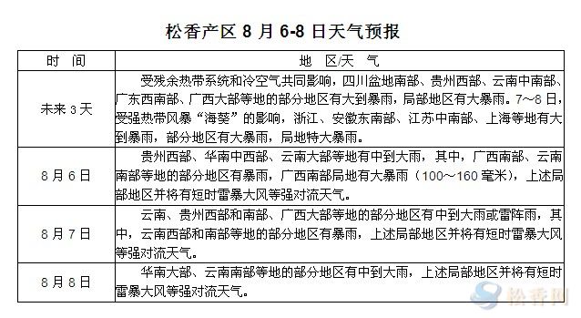 華訊松香網(wǎng)提醒:未來三天受殘余熱帶系統(tǒng)和冷空氣共同影響,兩廣、云貴等地局部有大到暴雨,松脂采收工作暫難恢復(fù)。另熱帶風(fēng)暴“???rdquo;將登陸東部沿海,江浙皖滬等地受影響。本周各主產(chǎn)區(qū)仍多陣雨天氣為主,且不乏短時(shí)暴雨的等天氣,松脂量方面將難有較大改善,對(duì)于部分前期接有8月份訂單的工廠有一定影響,為保證原料供應(yīng),部分地區(qū)工廠或適當(dāng)調(diào)整松脂收購價(jià)格。