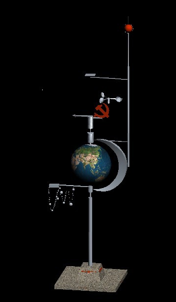 在采訪中,潘永鑫還提了一件令其興奮的事情。去年,在改革開放30年的日子里,他加入了中國共產(chǎn)黨,成為一名黨員。作為表達對黨的忠誠及改革開放30年的獻禮,他特設(shè)計了“黨徽風向標”城市雕塑。首先,他考慮了主體構(gòu)件:主軸、地球與月球模型、黨徽風向器、黨徽風速器。主軸蘊含著世界發(fā)展的主題:和平與發(fā)展,構(gòu)建和諧世界。它的下面鐫刻“向改革開放三十年獻禮”字樣,以此凸顯設(shè)計的主旨。地球與月球模型意味著綠色地球,和諧太空都是全人類共同的家園。在它們的上方,承接著風向器、風速器和黨徽,表示黨始終以全球思維,站在世界的高度,敏銳測控著風向和風速,深刻了解世界形勢的發(fā)展。然后,他設(shè)計了附件:避雷針、指南針和56個小球。避雷針連接在月球模型上,隱喻“在風雨雷電交加的日子,黨時刻關(guān)注民生,時刻保護著人民群眾的安全”;指南針連接在避雷針中央,含“黨領(lǐng)導(dǎo)全國人民走改革開放之路,方向目標明確而堅定不移”之意;56個小球掛在地球模型下方,示意56個民族在中國共產(chǎn)黨領(lǐng)導(dǎo)下,團結(jié)一心,為實現(xiàn)中華民族的偉大復(fù)興而努力奮斗。取材不銹鋼的整體構(gòu)件緊密相連,隨風而動。最后,他把這個設(shè)計的名稱叫做“黨徽風向標”。圖紙設(shè)計完畢,他又花了好幾天時間把模型做了出來?,F(xiàn)在,這個“黨徽風向標”就矗立在永新機械廠大樓的頂上。