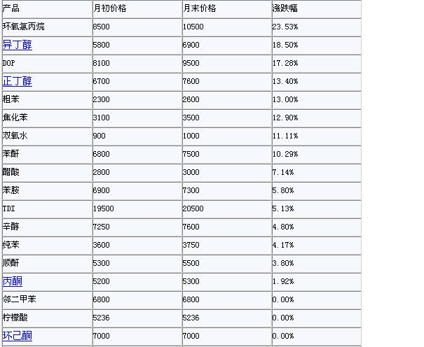 1.行情持續(xù)走高3月份在統(tǒng)計(jì)的35中化工產(chǎn)品中,有11種表現(xiàn)為延續(xù)了2月份的漲勢(shì),繼續(xù)攀升。在這11種產(chǎn)品中,又以環(huán)氧氯丙烷、粗苯、雙氧水、正丁醇表現(xiàn)最為搶眼,因?yàn)檫@4個(gè)產(chǎn)品兩個(gè)月的漲幅走在10%以上。以環(huán)氧氯丙烷為例,2月份環(huán)氧氯丙烷是漲幅榜的亞軍,漲幅在30.7%,而三月份,他榮升到了漲幅榜的冠軍位置,漲幅25.53%。分析其瘋長(zhǎng)的原因,主要是一國(guó)際原油價(jià)格的走高,推動(dòng)原料丙烯、液氯持續(xù)上行,從而導(dǎo)致了環(huán)氧氯丙烷廠家成本壓力增大,廠家一再上調(diào)出廠價(jià)格。3月環(huán)氧氯丙烷價(jià)格從月初的8500元/噸一路上行至10500元/噸。第二個(gè)原因是,社會(huì)整體供應(yīng)量有限,國(guó)內(nèi)生產(chǎn)企業(yè)開(kāi)工狀況一般,天津化工廠,江蘇安邦化工,年后一直未開(kāi)車,齊魯石化3月中下旬開(kāi)始停車檢修。當(dāng)前市場(chǎng)貨源偏緊,所以價(jià)格受到支撐,一再上漲。實(shí)際下游需求方面,樹(shù)脂企業(yè)普遍開(kāi)工較差,目前對(duì)環(huán)氧氯丙烷廠家提價(jià)抵觸情緒明顯,操作上多以隨用隨取為主,所以價(jià)格雖然一再攀升,但成交量相比往年有所萎縮。