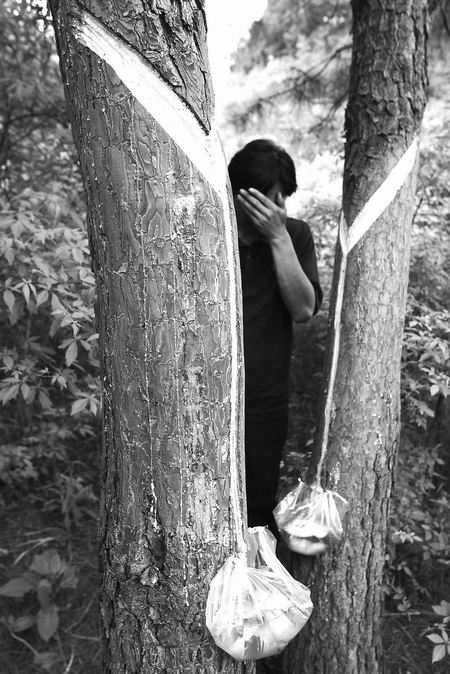 這里,一棵挨一棵的松樹被攔腰割開,開成一個大大的“Y”字口,下面用兩顆鐵釘直接刺入松樹樹干,鐵釘上掛著一個接收松脂的塑料袋。記者與一位當(dāng)?shù)卮迕裼镁沓哂嬃浚S機(jī)選擇的30棵被采割的松樹中,最粗一棵的胸徑是18厘米,最細(xì)一棵的胸徑才14厘米。而國家有明文規(guī)定,胸徑20厘米以下的嚴(yán)禁采割松脂。