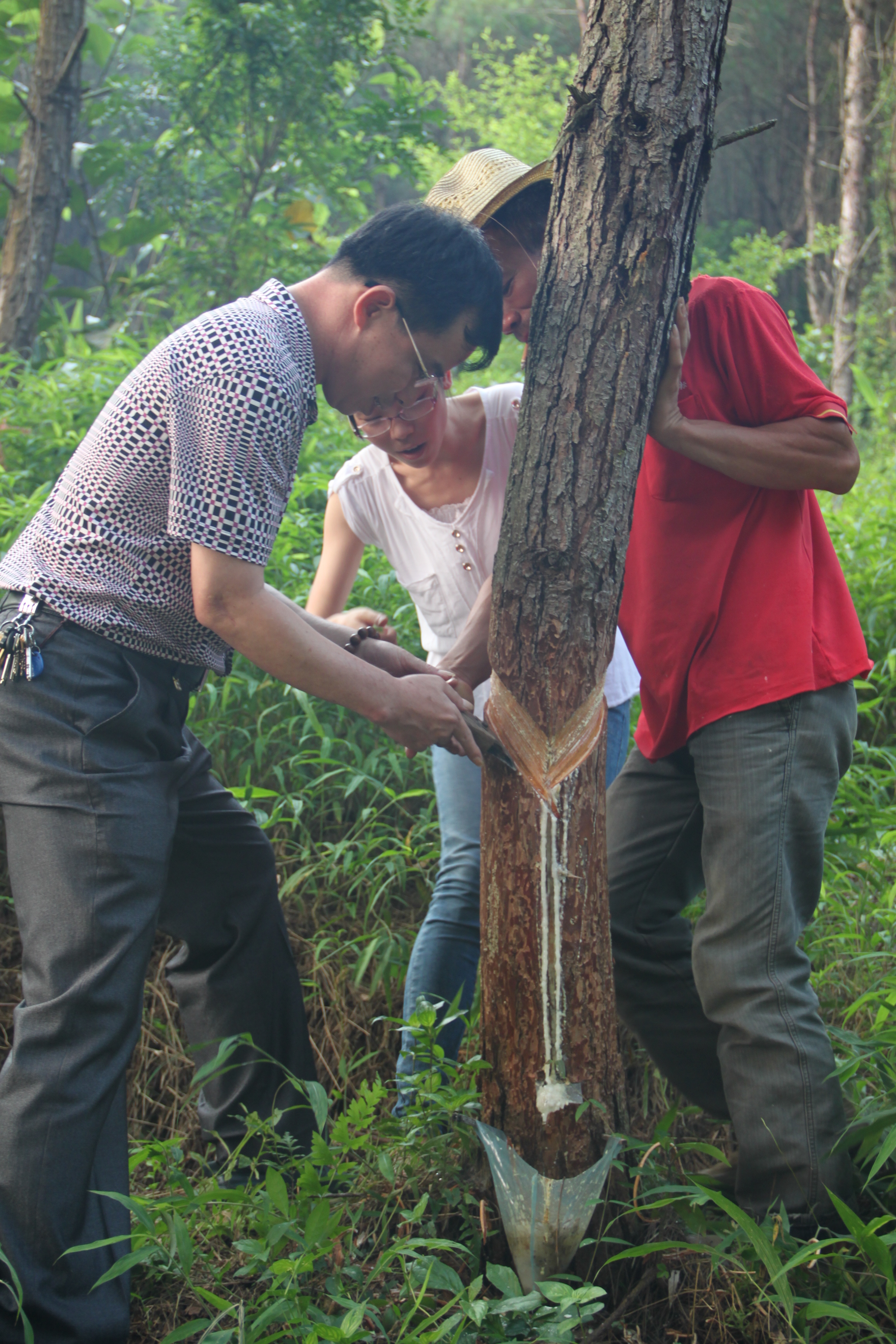 在封開縣的一片松林里,看完脂農(nóng)采脂,我們躍躍欲試,但無從下手。脂農(nóng)從割脂刀的握法、切割手法、力度和方向到切割的長度、深度,一點一點向我們講解并示范。實際操作之后才發(fā)現(xiàn),采脂并不像看起來那么容易,處處都是學(xué)問,并且是一件極辛苦的體力活。在有幾十年從業(yè)經(jīng)驗的他們面前,我們顯得如此笨拙,引導(dǎo)圍觀的脂農(nóng)笑聲不斷。