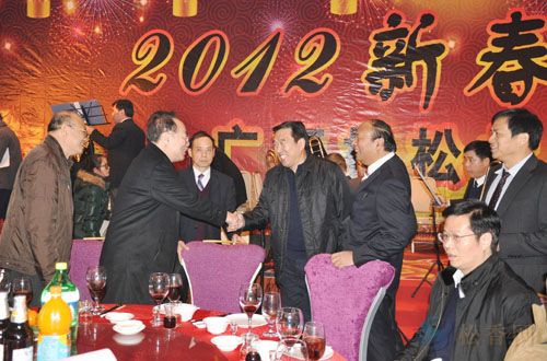 原自治區(qū)人民政府副主席雷宇(左二)與中共梧州市委書記劉志勇(左三)在團拜會上握手致意,左為自治區(qū)人民政府駐廣州辦事處主任徐勵明;右前為中共梧州市委常委、組織部長譚丕創(chuàng);右三為董事長孔仕才;右一為總經(jīng)理車乾池。