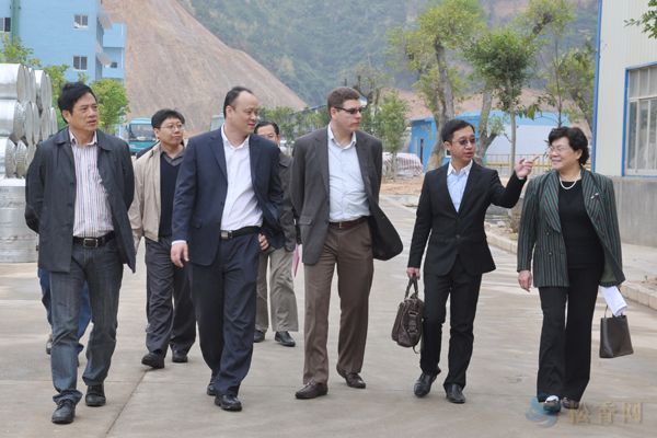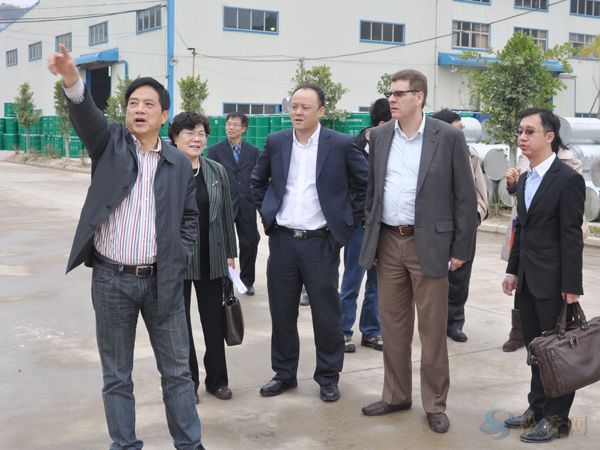 考察團在廠區(qū)考察。左三為亞太區(qū)生產總監(jiān)Ricardo、左二為大中華區(qū)銷售總監(jiān)姚健清,左一為總經理車乾池,右一公司副總經理全楚娃。