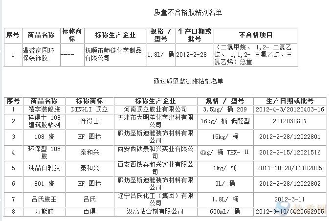 日前,天津市工商局在流通領(lǐng)域?qū)?biāo)稱河南、河北、遼寧、陜西、廣東、天津等6個(gè)省、直轄市8家企業(yè)生產(chǎn)的9個(gè)批次膠粘劑開展質(zhì)量監(jiān)測。依據(jù)GB18583-2008《室內(nèi)裝飾裝修材料膠粘劑中有害物質(zhì)限量》、JC/T438-2006《水溶性聚乙烯醇建筑膠粘劑》及經(jīng)備案現(xiàn)行有效的商品明示企業(yè)標(biāo)準(zhǔn),重點(diǎn)檢測了溶劑型膠粘劑的外觀、剪切強(qiáng)度、不揮發(fā)物含量、黏度、粘度、異氰酸酯基含量、初粘剪切強(qiáng)度、初粘剝離強(qiáng)度、剝離強(qiáng)度、游離甲醛、苯、甲苯+二甲苯、甲苯二異氰酸酯、(二氯甲烷、1,2-二氯乙烷、1,1,2-三氯乙烷、三氯乙烯)總量、總揮發(fā)性有機(jī)物等15項(xiàng)指標(biāo);水基型膠粘劑的外觀、pH值、黏度、不揮發(fā)物、最低成膜溫度、木材污染性、壓縮剪切強(qiáng)度、粘結(jié)強(qiáng)度、低溫穩(wěn)定性、游離甲醛、苯、甲苯+二甲苯、總揮發(fā)性有機(jī)物等13項(xiàng)指標(biāo)。主要問題是1個(gè)批次溶劑型膠粘劑(二氯甲烷、1,2-二氯乙烷、1,1,2-三氯乙烷、三氯乙烯)總量指標(biāo)不合格。