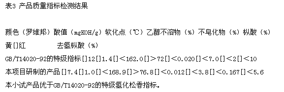 根據(jù)國(guó)家標(biāo)準(zhǔn)GB/T14020-92的試驗(yàn)方法,檢測(cè)研制的氫化松香產(chǎn)品結(jié)果見(jiàn)表3。