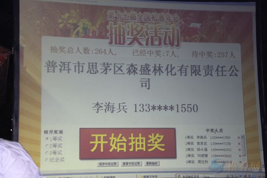 當(dāng)主持人華訊松香網(wǎng)主編仇志利女士宣布抽獎(jiǎng)即將開始時(shí),大家都相繼放下手中酒杯,期待神秘大獎(jiǎng)的揭曉。為確保公平公正,大會(huì)組委會(huì)特別設(shè)置了電子抽獎(jiǎng)系統(tǒng),隨機(jī)抽取獲獎(jiǎng)人員。隨著六名三等獎(jiǎng)、三名二等獎(jiǎng)得主的抽取,在座的參會(huì)代表們心情越來越緊張,滾動(dòng)的電腦屏幕牽動(dòng)著所有人的心,300多雙眼睛緊盯著大屏幕,等待著那一聲“停!”。當(dāng)“普洱市思茅區(qū)森盛林化有限責(zé)任公司 李海兵”的字幕出現(xiàn)時(shí),大獎(jiǎng)得主揭曉。
