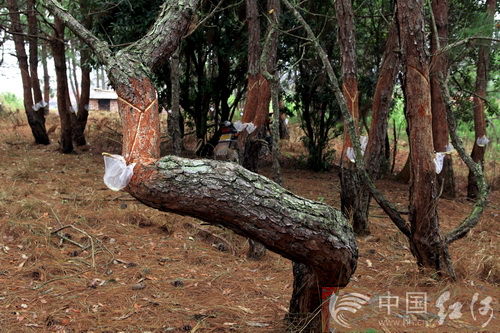 一陣山風吹過,山野的松林“沙沙”作響,如泣似訴。凡有松樹處,無論粗細高矮,都難逃剝皮厄運。那些松樹的樹干,無一例外地被剝?nèi)淦ぃ⒏畛?ldquo;Y”字形刀口,“Y”字底部都有一個塑料袋,用于裝載汩汩滲出的松脂。